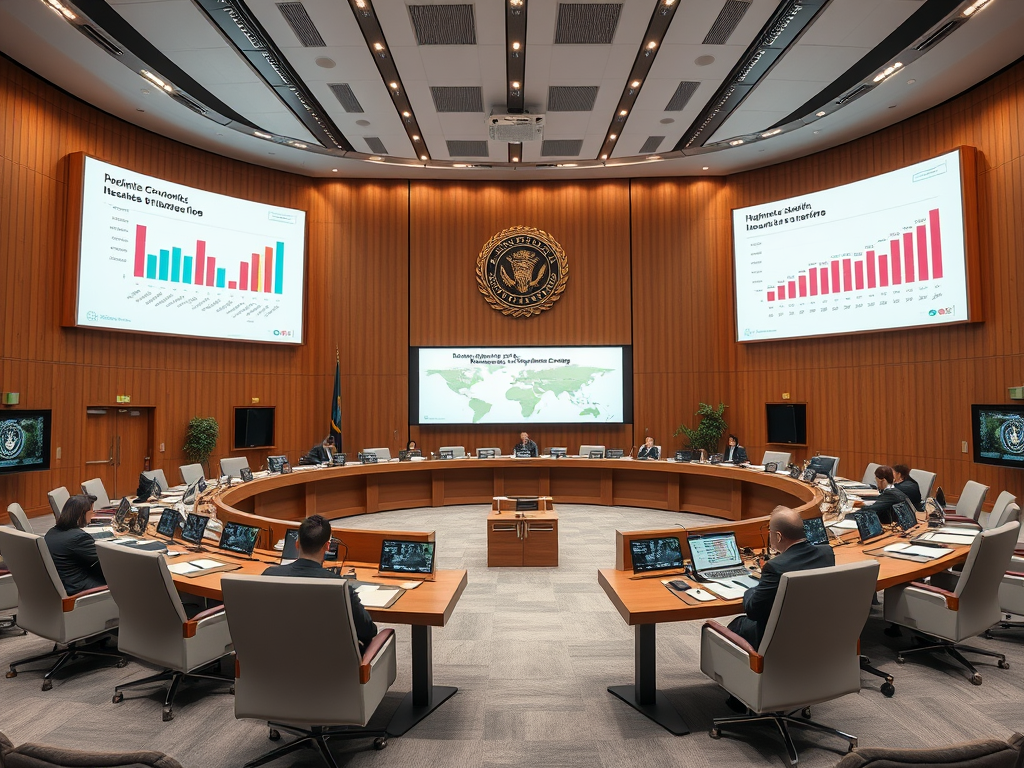 A government meeting room where charts of happiness, health, environment, and economy are displayed together on large screens.