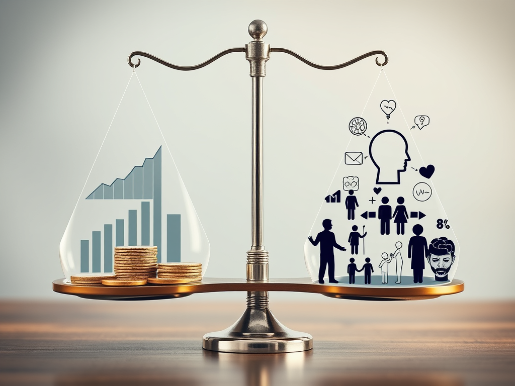 A scale balancing economic symbols (charts, coins) on one side and human well-being symbols (family, community, mental health) on the other.