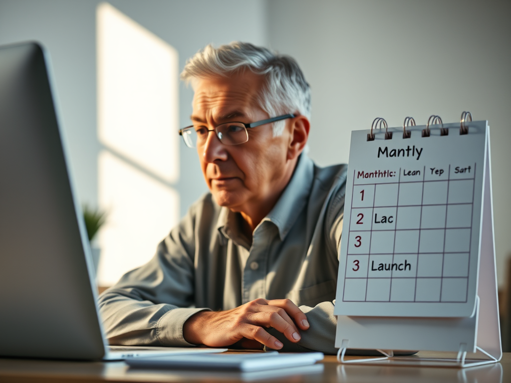 “A calendar marked ‘Month 1: Learn,’ ‘Month 2: Create,’ ‘Month 3: Launch,’ next to a senior working calmly at a desk.”