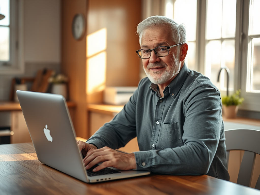 “A confident senior man or woman using a laptop at a kitchen table, sunlight through the window, calm expression, notebook beside them, realistic home setting.”