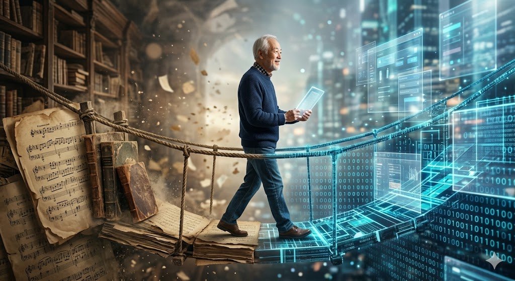 An artistic, symbolic image showing a bridge. One side of the bridge is made of old sheet music and antique books; the other side is glowing digital binary code and holographic screens. A senior figure is confidently walking across the bridge toward the digital side, holding a glowing e-book.]