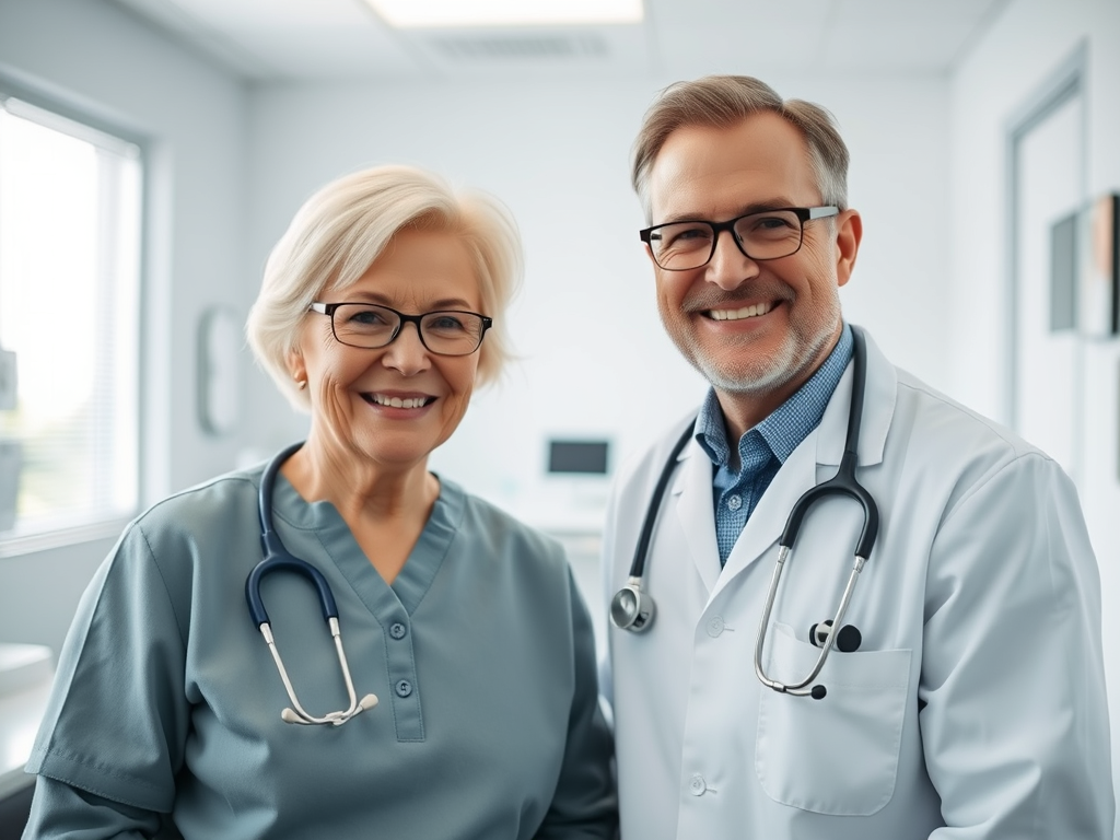“Canadian medical clinic interior, friendly doctor and senior patient, clean healthcare environment, professional atmosphere”