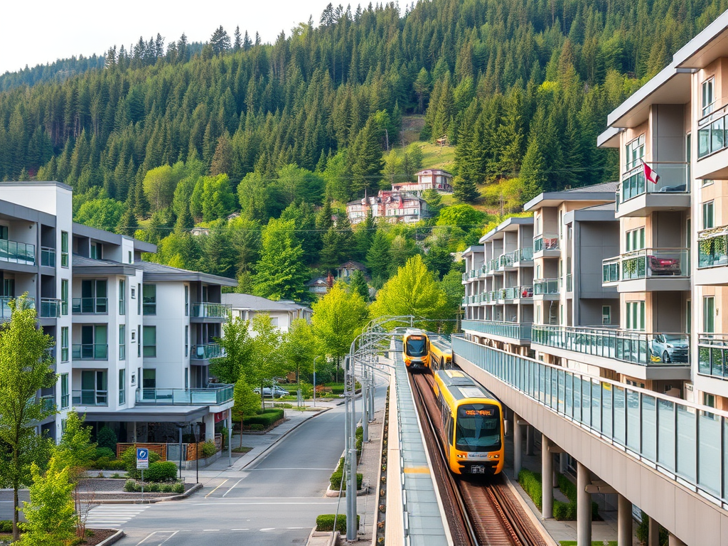 “Modern residential area in Coquitlam, Canada, SkyTrain station nearby, forested hills, clean urban design, calm senior-friendly environment”