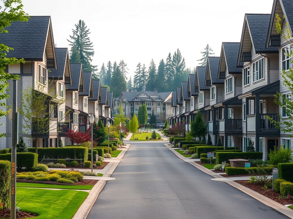 “Quiet suburban neighborhood in South Surrey, Canada, wide streets, modern townhouses, green parks, peaceful retirement lifestyle, soft natural lighting”