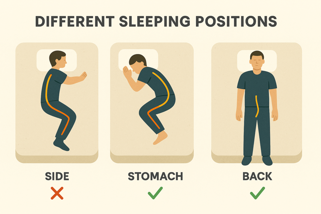 “Different sleeping positions on mattress, spinal alignment comparison”