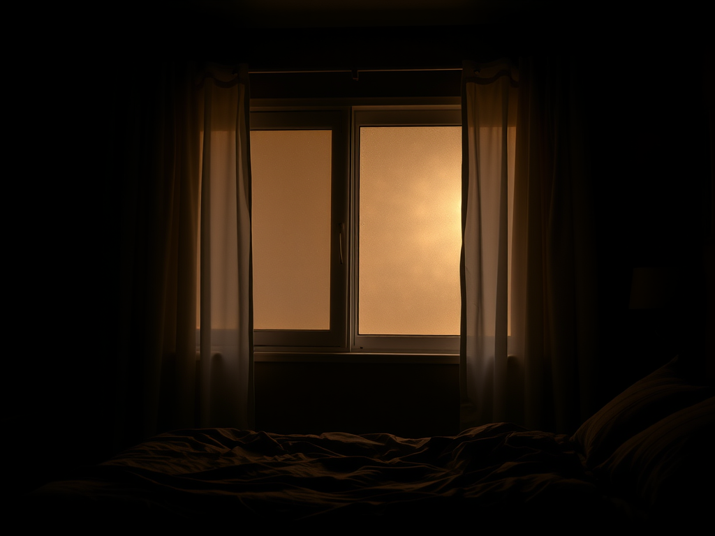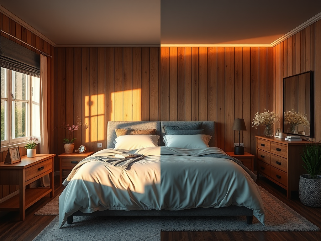 “Morning sunlight entering bedroom vs dark evening room with warm lighting, comparison”