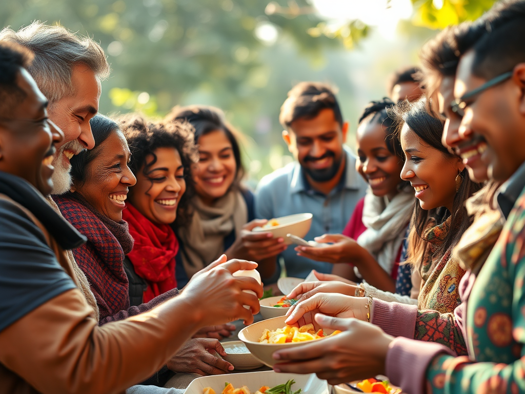 A diverse community helping each other—sharing food, offering support, donating. Warm, hopeful atmosphere.