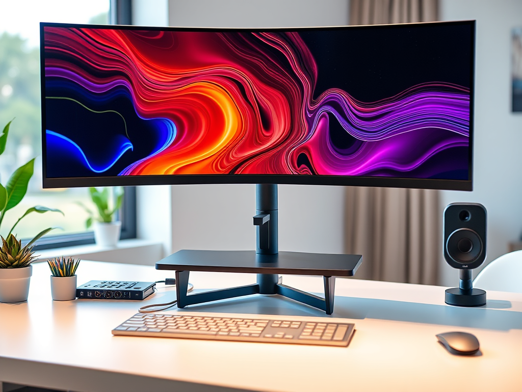 “Modern home office setup with large external monitor, laptop stand, clean desk, natural light, minimalist style”